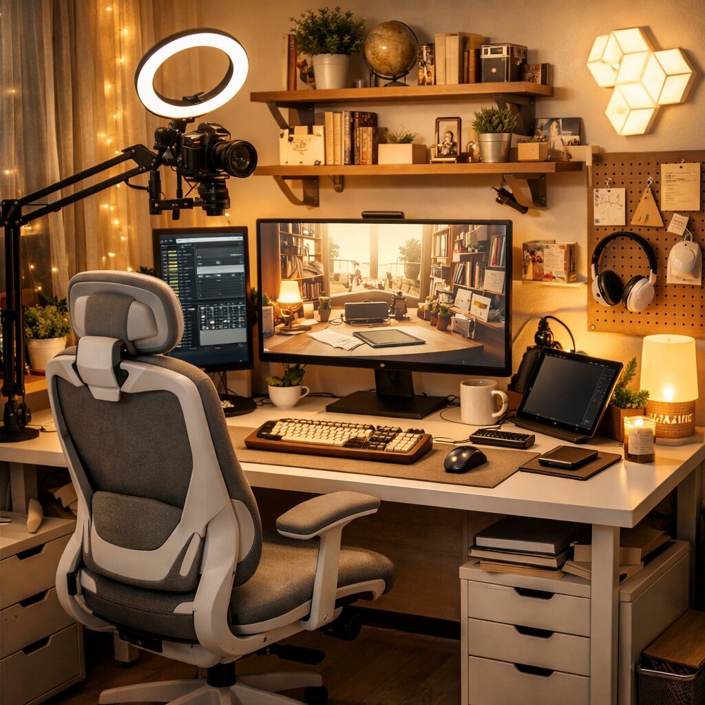 • Ergonomi ve Oturuş: Saatlerce yayın yapmak ve tasarım üretmek omurganızı tüketir. Kamera karşısında dik durmanızı sağlayan, özellikle uzun saatler bağdaş kurarak oturmayı sevenler için geniş oturma alanına sahip profesyonel ve estetik bir ofis/oyuncu koltuğu, markanızın en büyük fiziksel yatırımıdır.