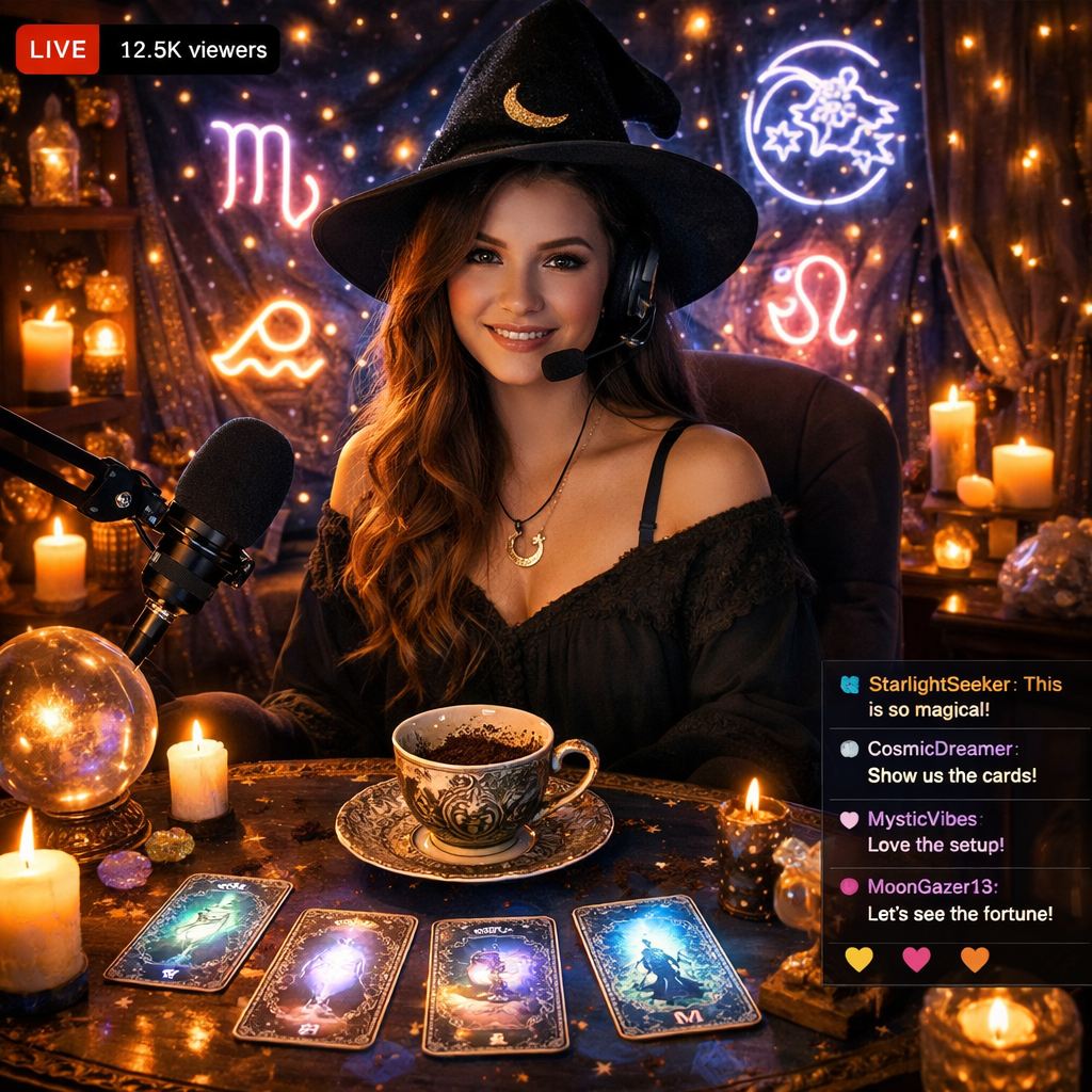 • Kahve Falı ve Tarot: Canlı yayında kahve fincanı kapatıp izleyiciler için yorumlar yapmak veya Tarot kartları açmak, platformun en çok hediye (Diamond) toplayan konseptlerinden biridir. Bu konseptte, “Detaylı kahve falı veya kişiye özel tek kart tarot açılımı için [Belirli Bir Hediye] atmanız yeterlidir” şeklinde doğrudan, hizmet odaklı ve muazzam kazançlı bir abonelik/ödül modeli yaratabilirsiniz. İzleyiciler kendi fallarını duymak için saatlerce odada sıranın kendilerine gelmesini beklerler.